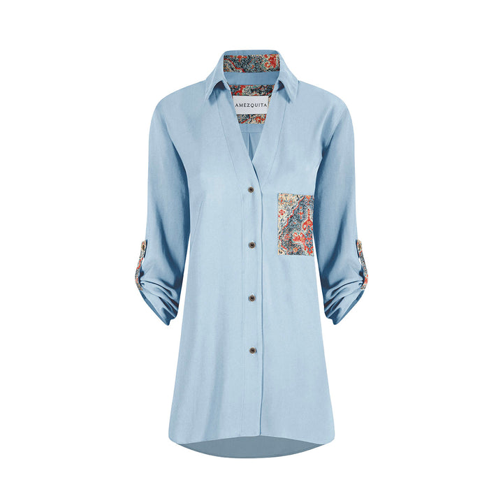 La camisa se redefine en una silueta prolongada y precisa, donde el color se encuentra con el telar. El bolsillo en telar, junto con los detalles en el interior del cuello y las mangas, trazan un contraste sutil que resalta la geometría del diseño.