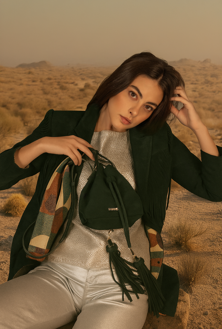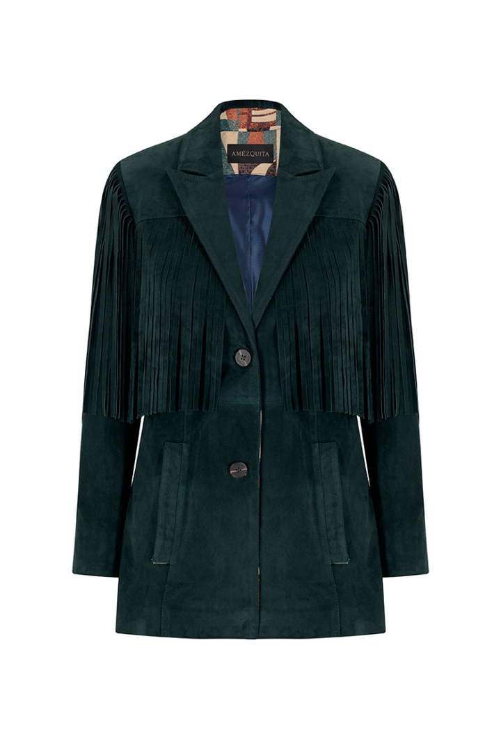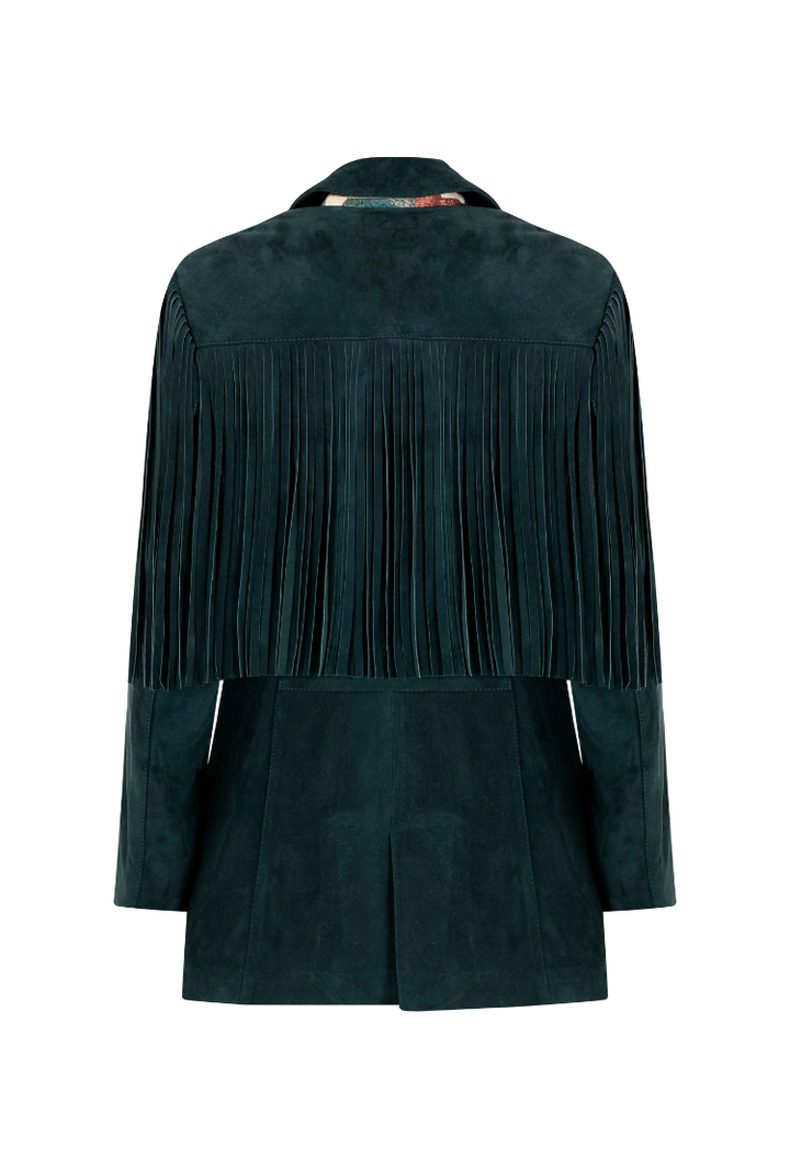 Chaqueta en cuero verde pato con flecos Etérea x Sabandija