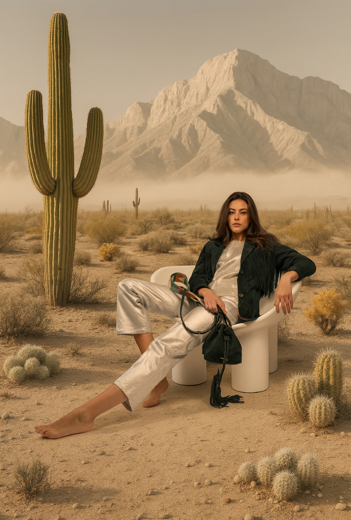 Chaqueta en cuero de becerro, The perfect mix and match, la sobriedad del blazer with the power move: flecos largos al frente y en la espalda. Movimiento y ligereza interrumpen la estructura clásica, mientras el forro introduce un contraste discreto. Con botones frontales y bolsillos laterales, equilibra la sastrería con un guiño contemporáneo.