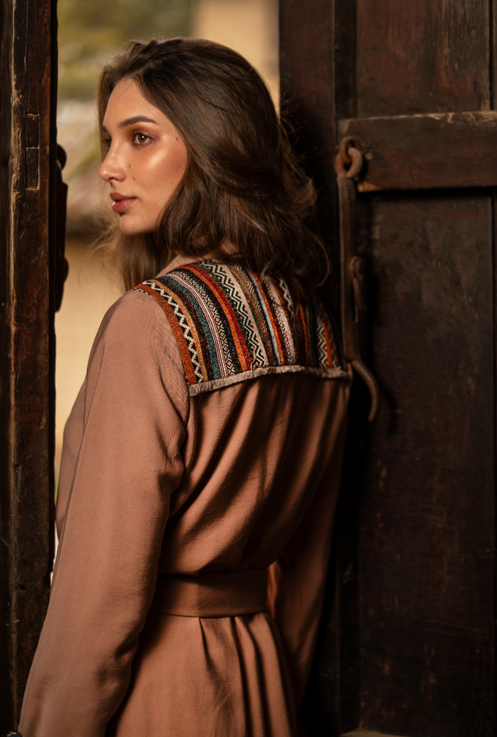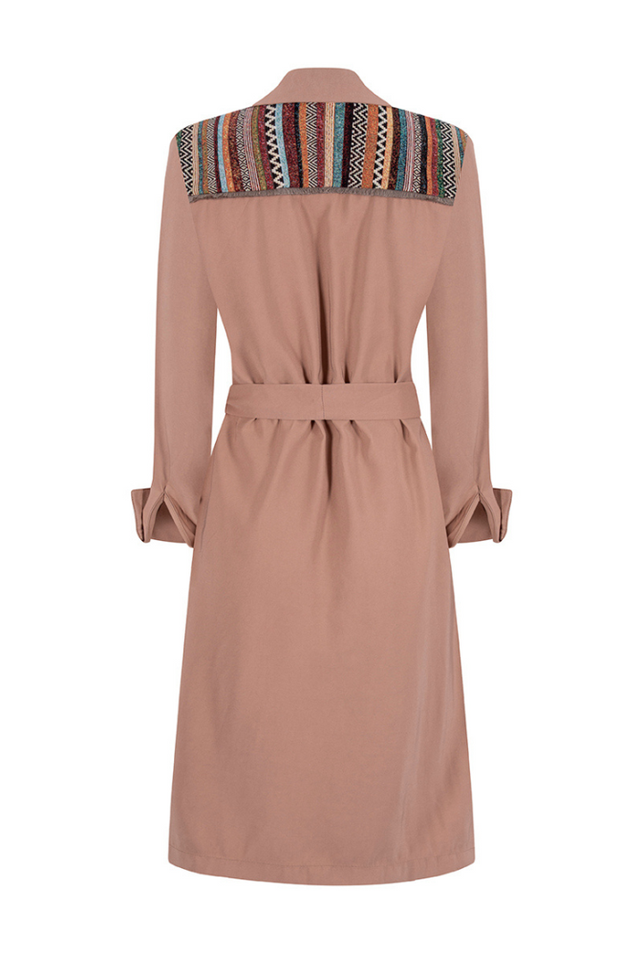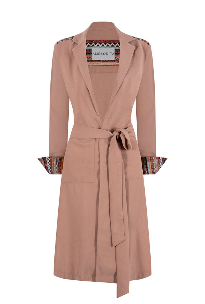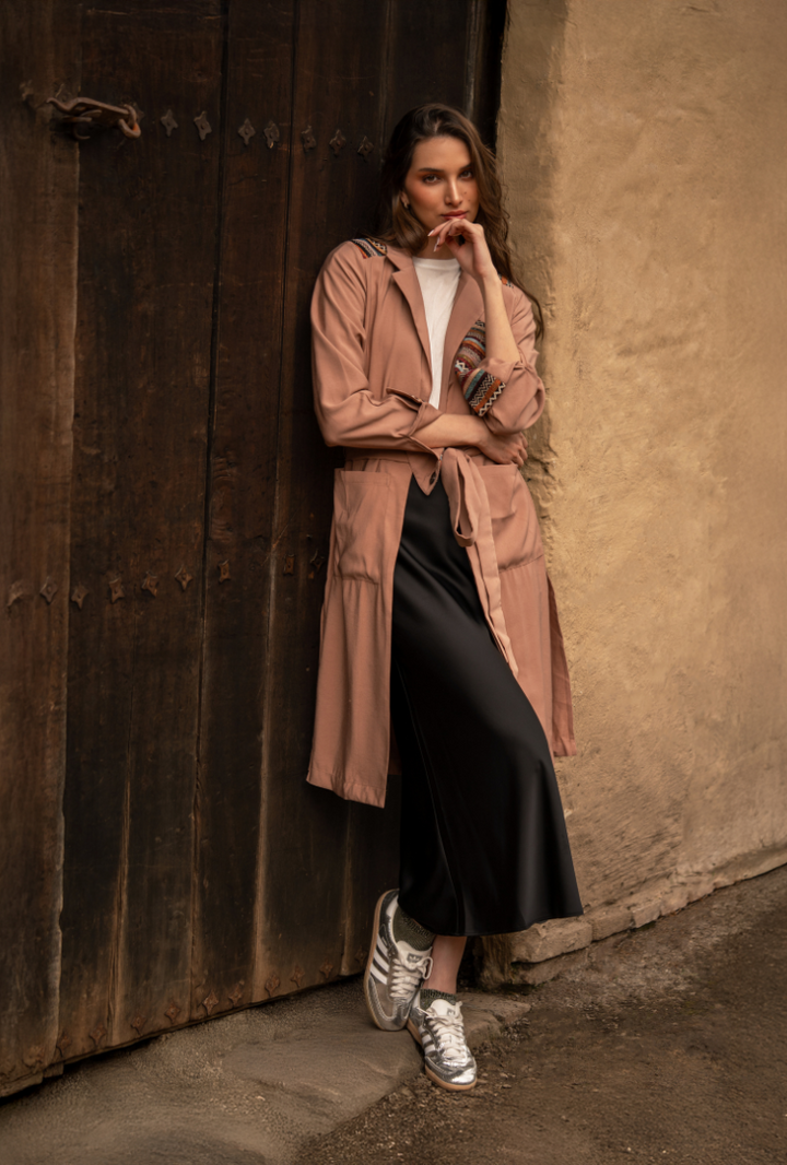 Trench coat con cinturón y detalles en telar. Ligero y versátil con silueta al cuerpo y caída fluida. El cinturón permite ajustar la forma según el estilo, mientras que los detalles en telar añaden textura y un contraste sutil. Ideal para looks de capas, se puede llevar abierta o entallada, perfecta para elevar un conjunto básico.